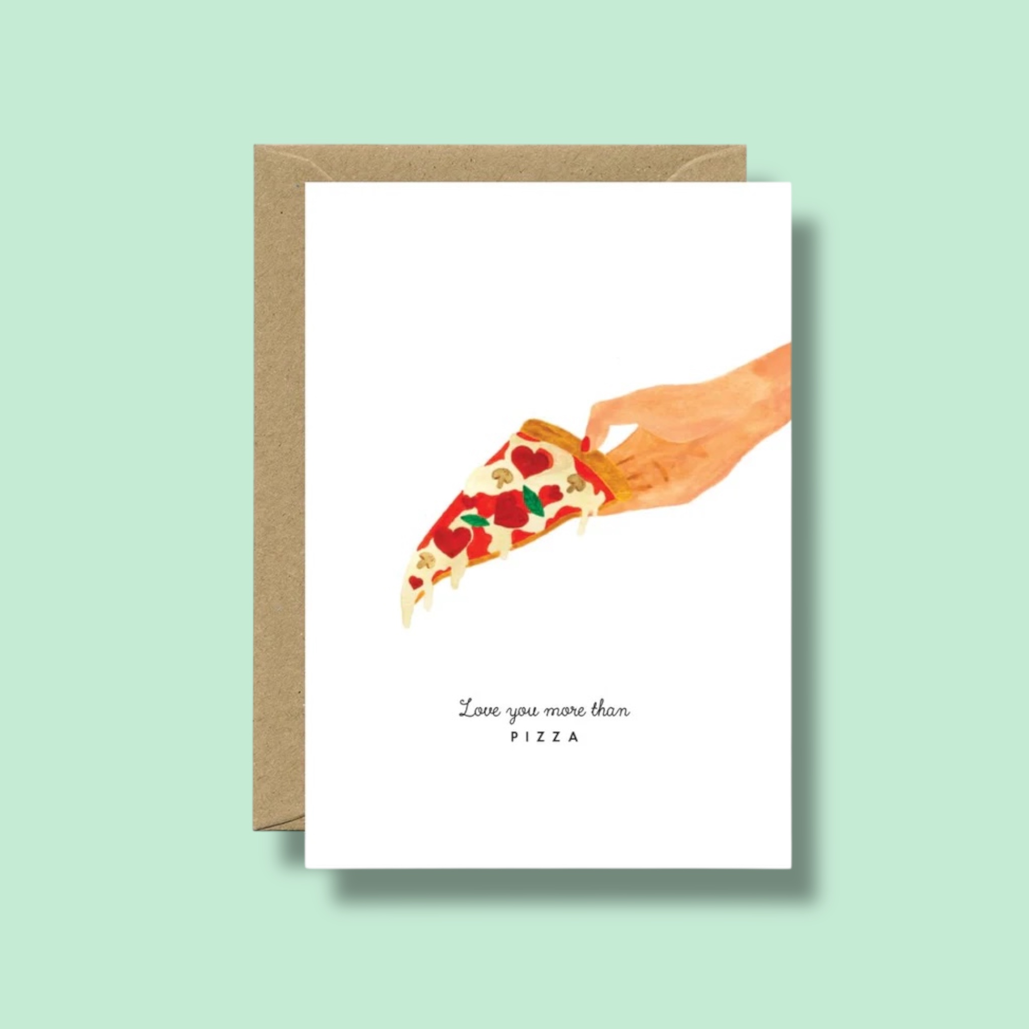 Grusskarte LOVE YOU MORE THAN PIZZA bringt Humor und Herz in jedes Geschenk. Diese nachhaltige A6 Grusskarte aus Recyclingpapier wird mit einem recycelten Kraftpapier-Umschlag geliefert und eignet sich perfekt für Geburtstage, Dankesbotschaften oder kleine Aufmerksamkeiten zwischendurch.