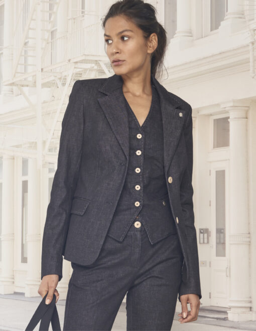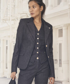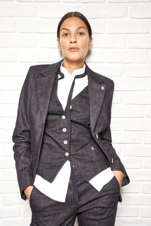 Blazer LISA Jacket Black Denim verbindet modernen Stil mit Nachhaltigkeit. Der taillierte, kurze Schnitt und der hochwertige Denimstoff sorgen für ein angenehmes Tragegefühl über das ganze Jahr. Diese nachhaltige Damenjacke lässt sich vielseitig kombinieren – ob im Büro, Alltag oder zu besonderen Anlässen.