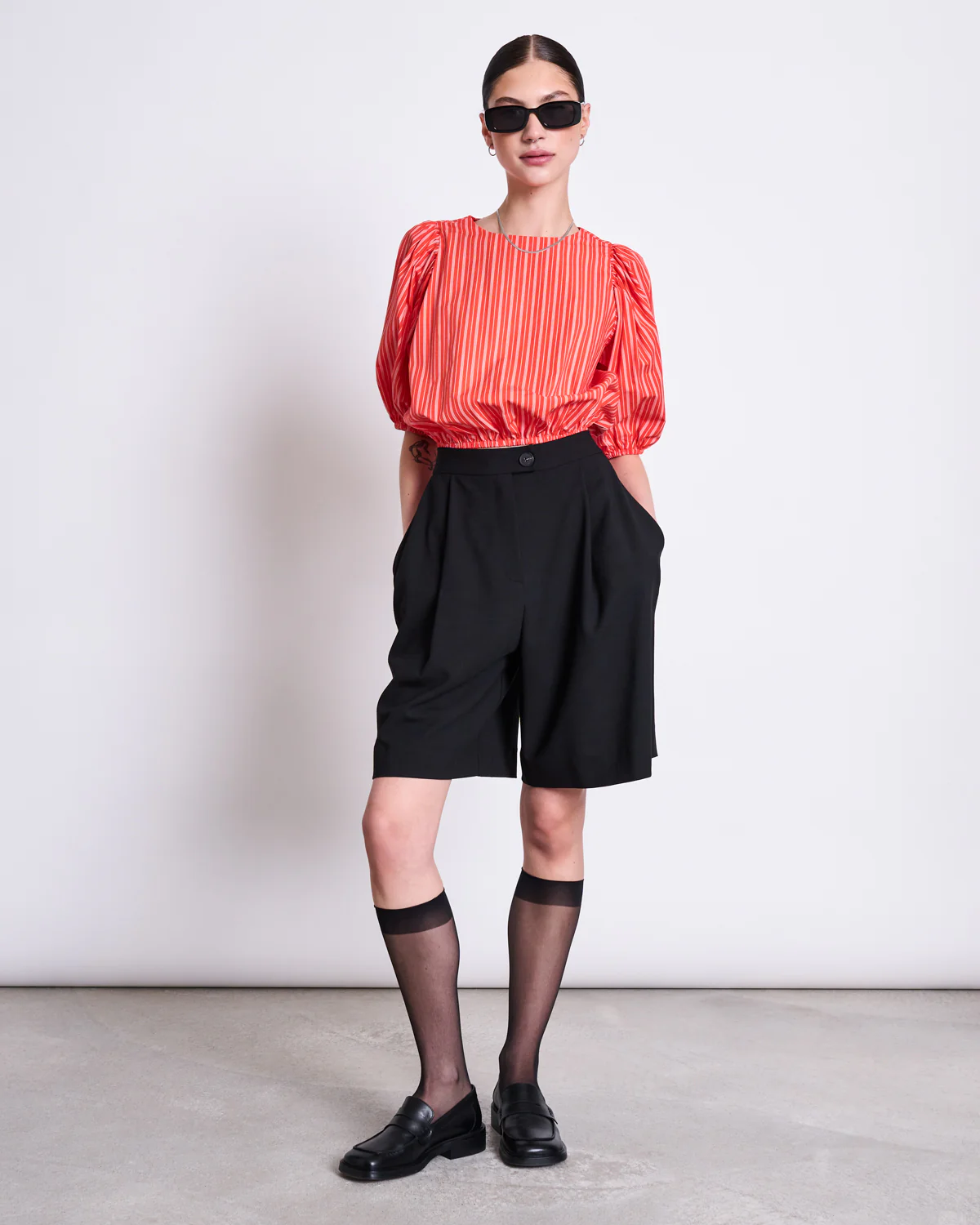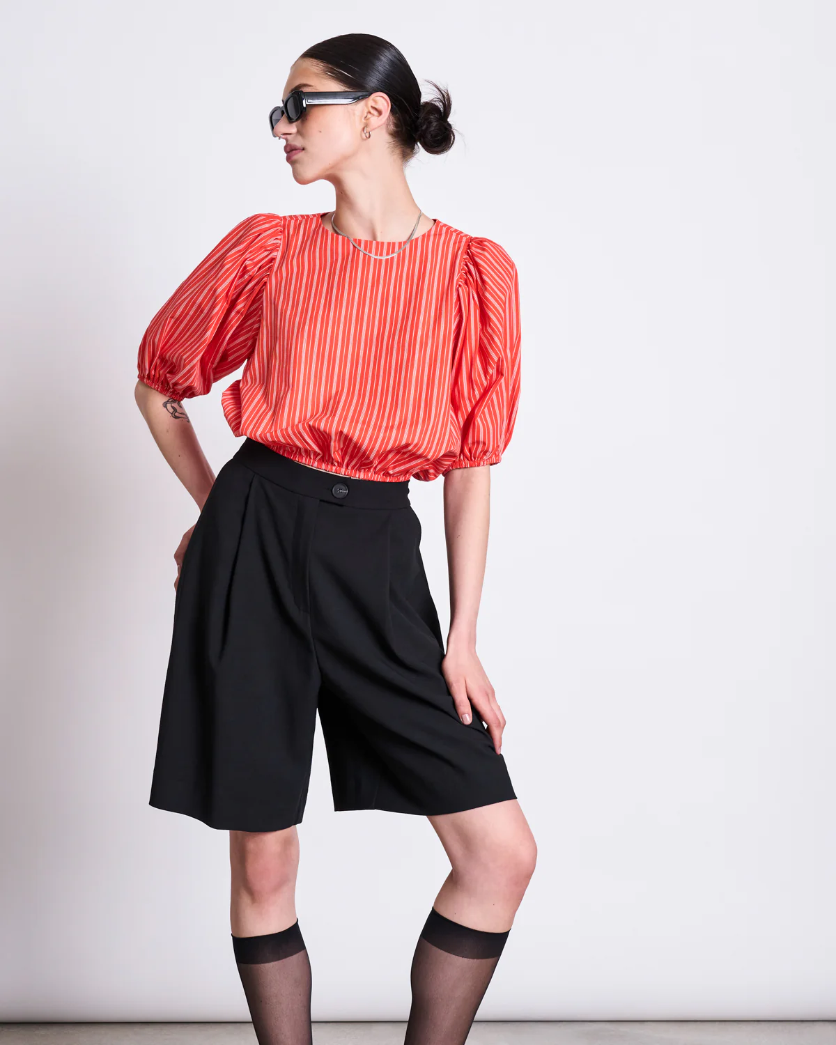 Du liebst romantische Details und einen femininen Look? Dann ist LAIDE, eine leicht geraffte Bluse aus nachhaltiger Bio-Baumwolle, dein neues Lieblingsstück. LAIDE überzeugt mit einem hohen, schmalen Halsausschnitt, voluminösen Puffärmeln und liebevoll gesetzten Rüschen an Ärmeln und Saum.