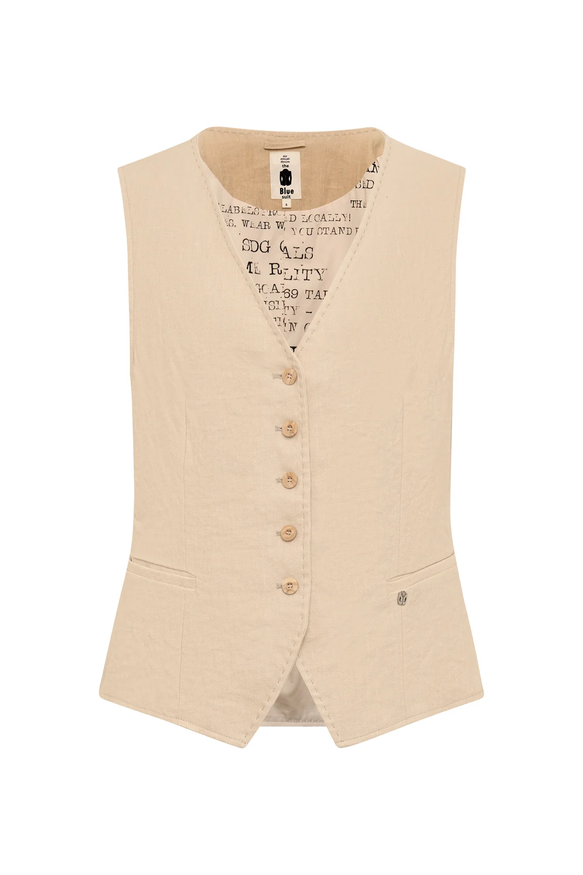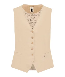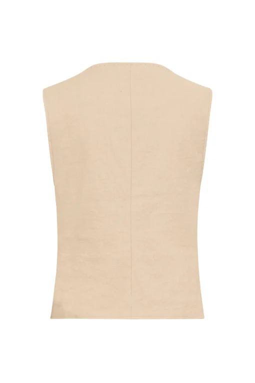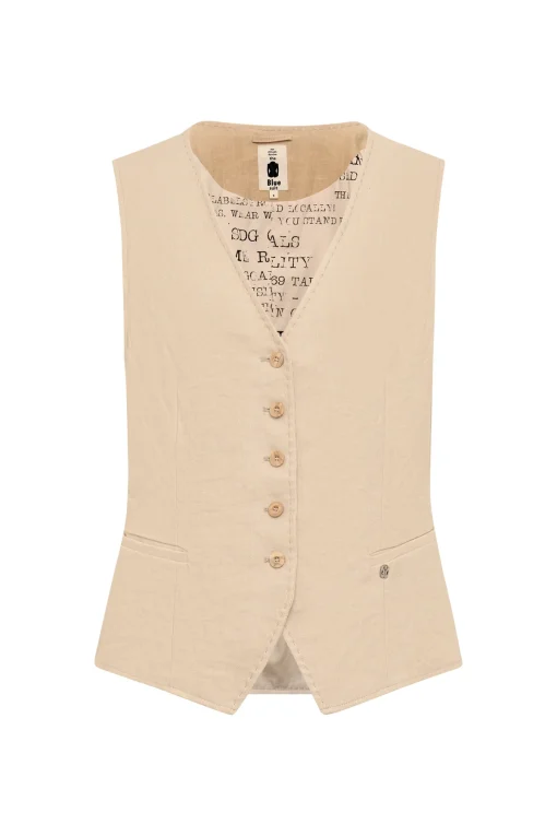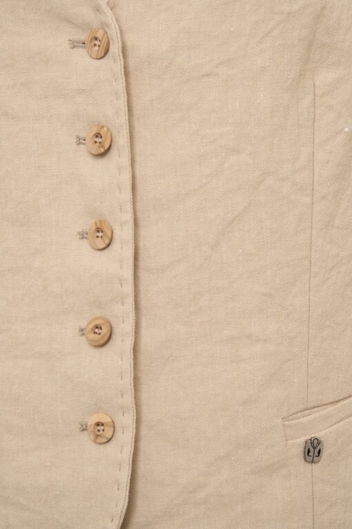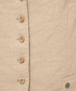 Leinen Gilet EMI Linen verbindet klare Linien mit nachhaltiger Qualität. Die taillierte Passform betont die Figur und verleiht jedem Look Struktur – ideal für Büro oder Freizeit. Zwei Fronttaschen bringen praktische Funktionalität, während fünf natürliche Holzknöpfe das Design abrunden und einen natürlichen Akzent setzen.