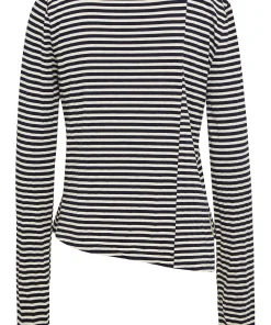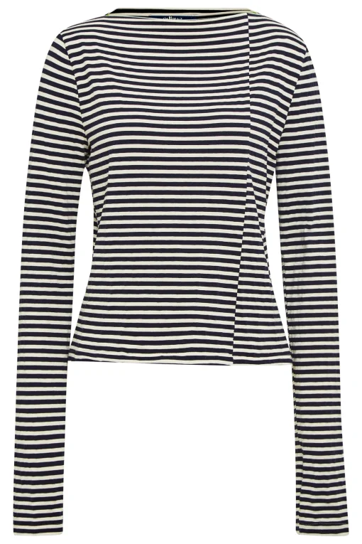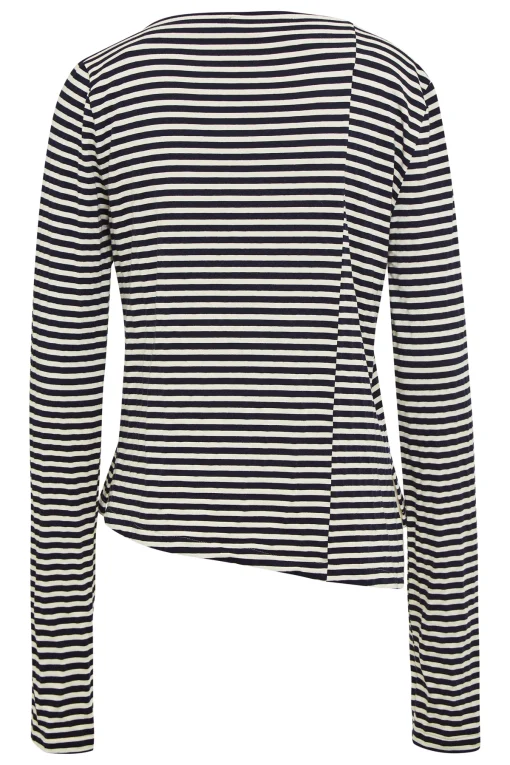 Die klassischen blau-weißen Streifen sorgen für einen eleganten oder maritimen Look, während der asymmetrische Schnitt dem Shirt eine moderne, auffällige Note verleiht. Ob du es im Business-Style mit Stoffhose und Pumps trägst oder casual mit Jeans und Flats – das CARLY Shirt ist vielseitig kombinierbar und passt sich deinem Alltag mühelos an.