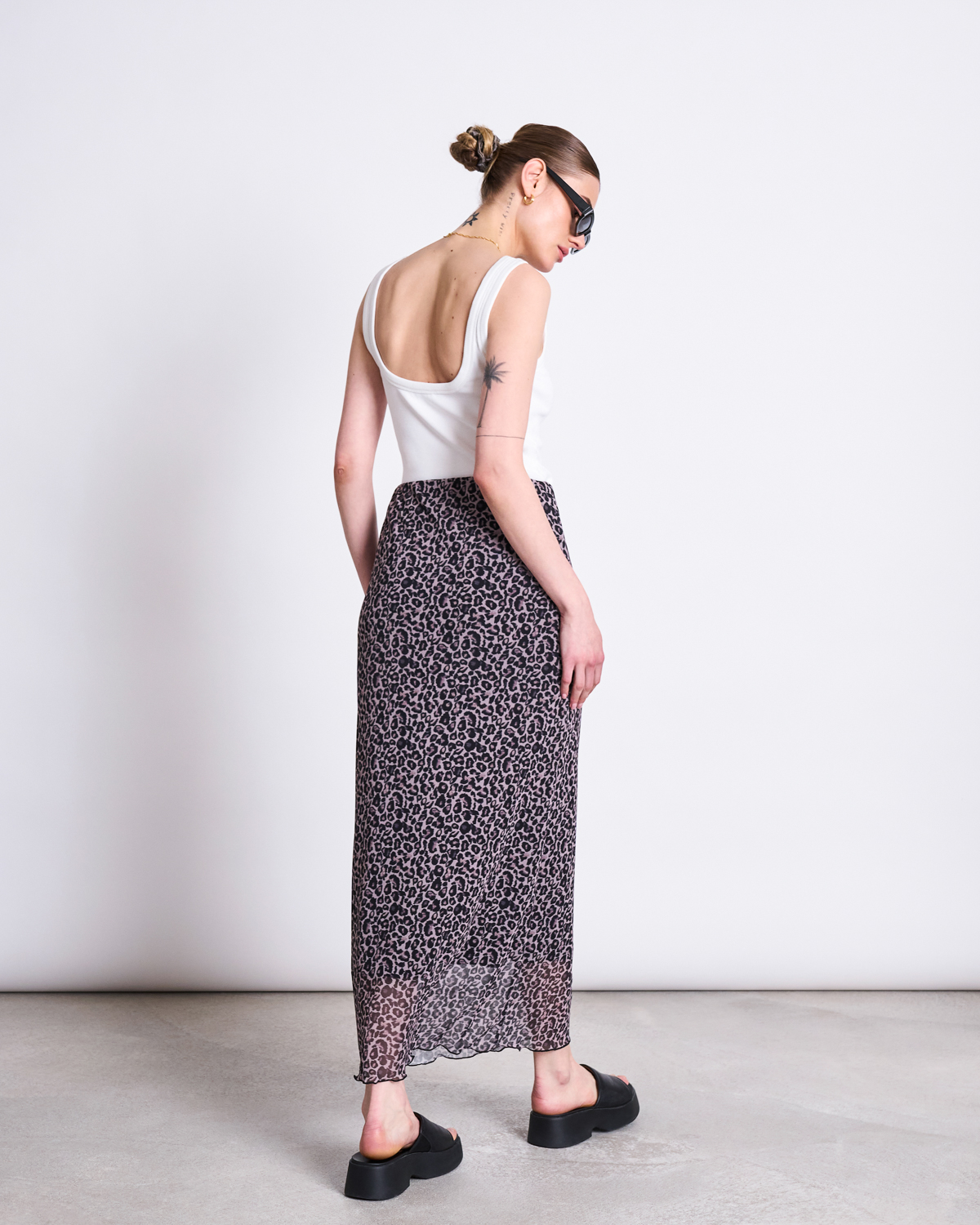 Mesh Maxi Skirt SMUK kombiniert eine schmale, figurbetonte Passform mit einem leichten Meshstoff, der jedem Look Dynamik verleiht. Der Maxirock im Leo-Print eignet sich für besondere Anlässe, Festivals oder als auffälliges Statement im Alltag. Der fließende Fall und das luftige Material unterstreichen die feminine Silhouette und schaffen einen modernen Streetstyle-Charakter.