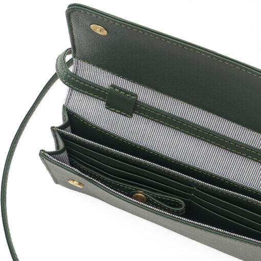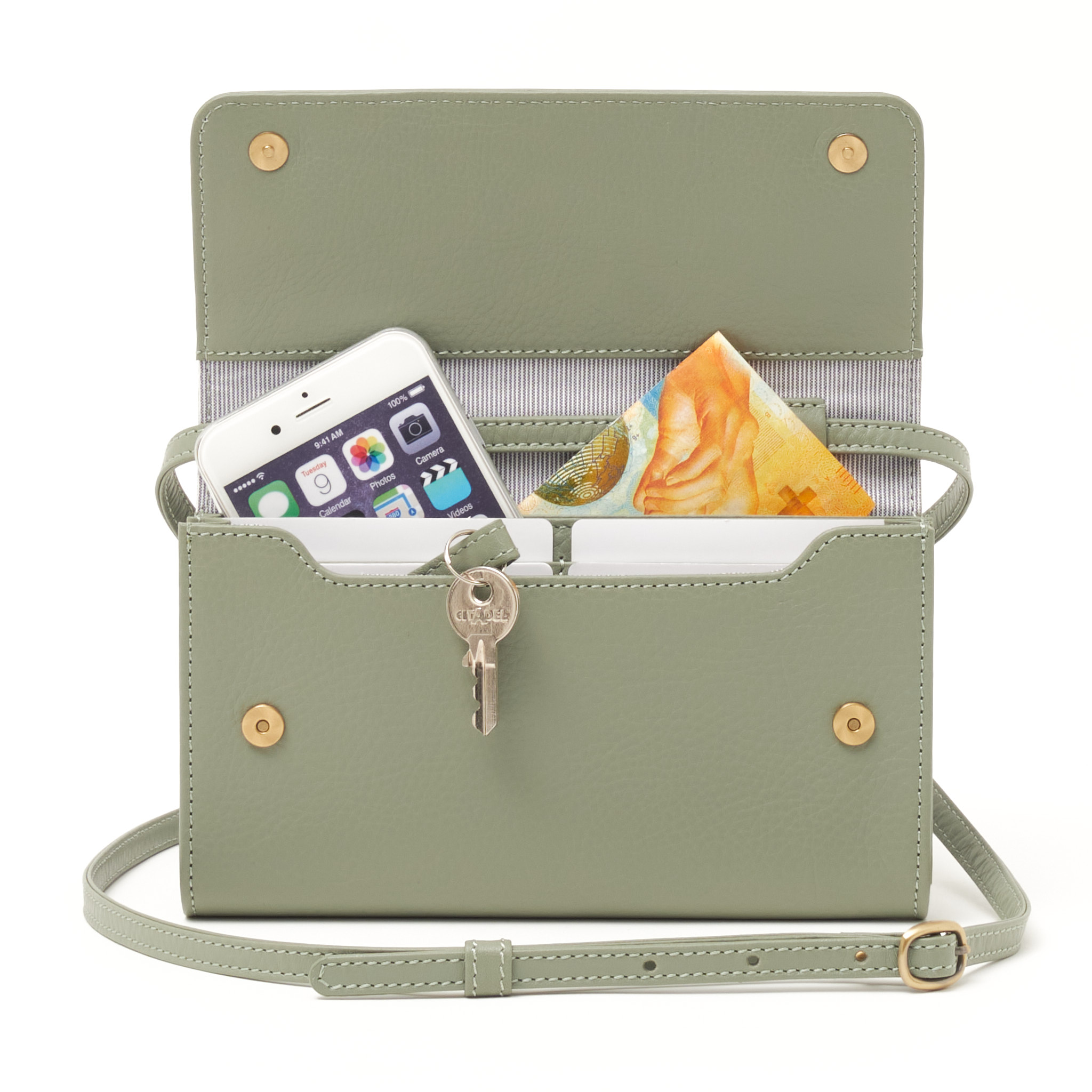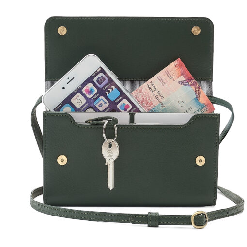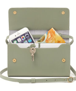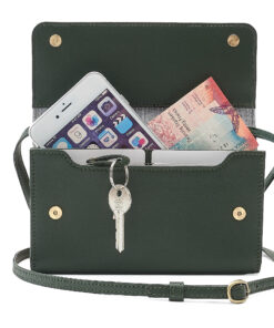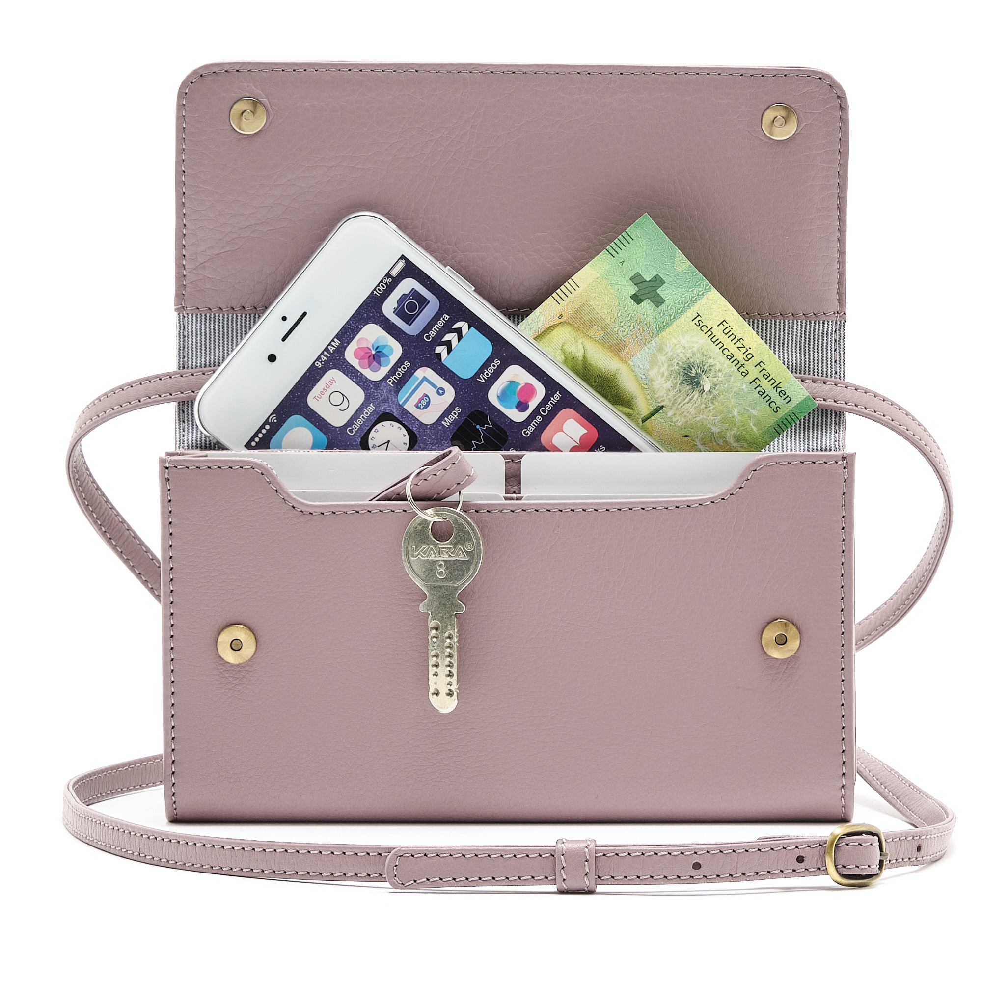 Sie bietet Platz für Handy, Karten, Bargeld, Schlüssel und kleine Accessoires.