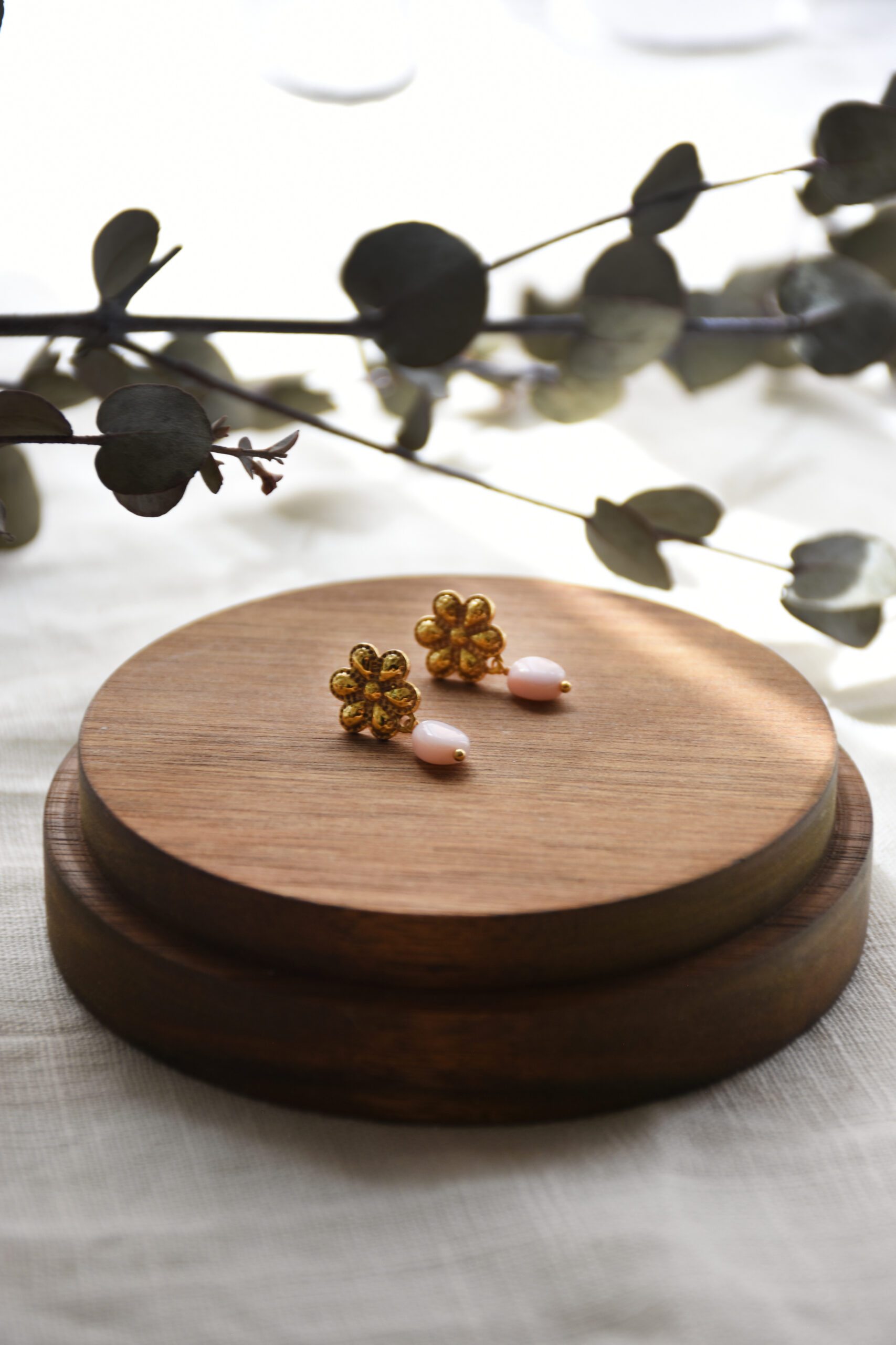 Ohrring LALITA vereint Rosa Opal und feine Handwerkskunst zu einem Schmuckstück voller Wärme und Charakter. Der sanft geschliffene Stein steht für Mitgefühl und Harmonie, während die vergoldete Blütenform aus Messing jedem Look eine poetische Note verleiht. Dieser vergoldete Ohrring für Damen passt perfekt zu dezenten Outfits wie auch zu besonderen Momenten.