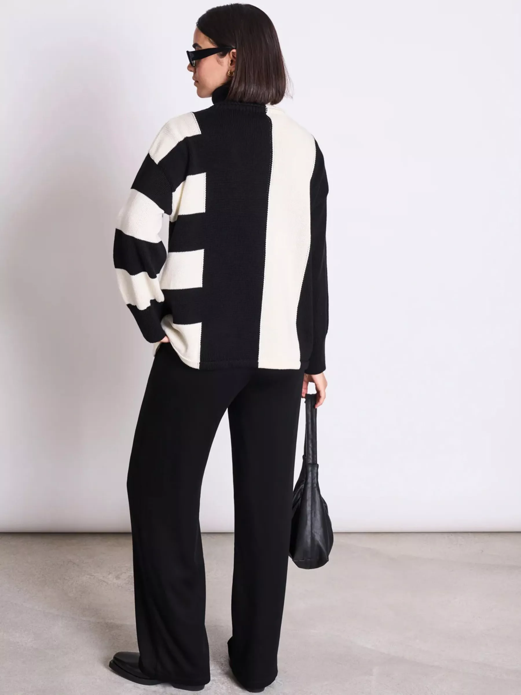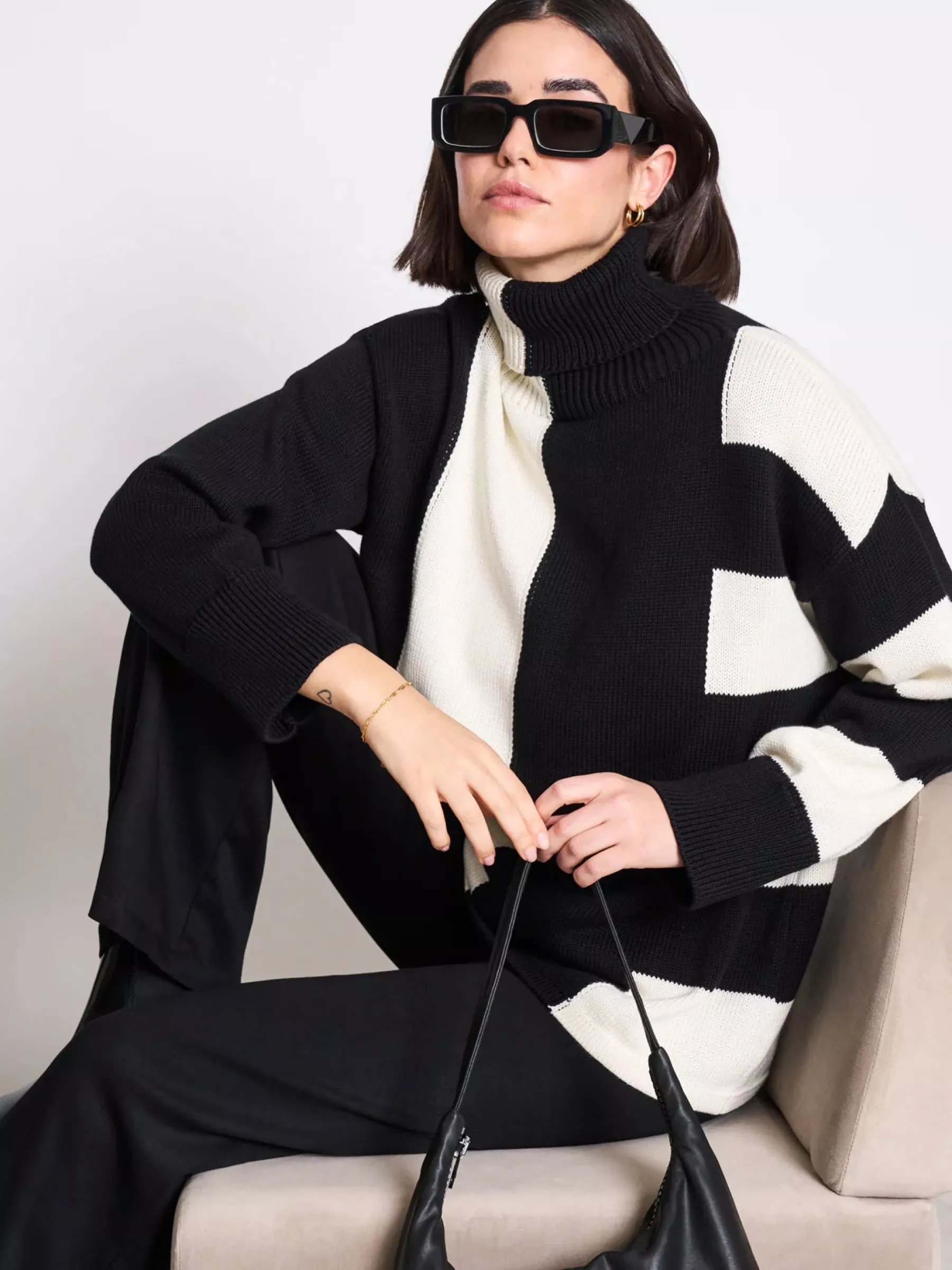 Rollkragenpullover ALTIN bietet dir einen klaren Stil mit modernem Blockmuster in Offwhite und Schwarz. Der hohe Rollkragen, der lockere Schnitt und die weiten Ärmel sorgen für einen markanten Look, der sich leicht kombinieren lässt. Der schwere Strick aus 100 % GOTS-zertifizierter Bio-Baumwolle gibt dem Pullover Form und Struktur und passt ideal zu Alltag und Streetstyle. Wichtige Keywords wie Rollkragenpullover Damen und Oversized Pullover greifen den Stil sicher auf.