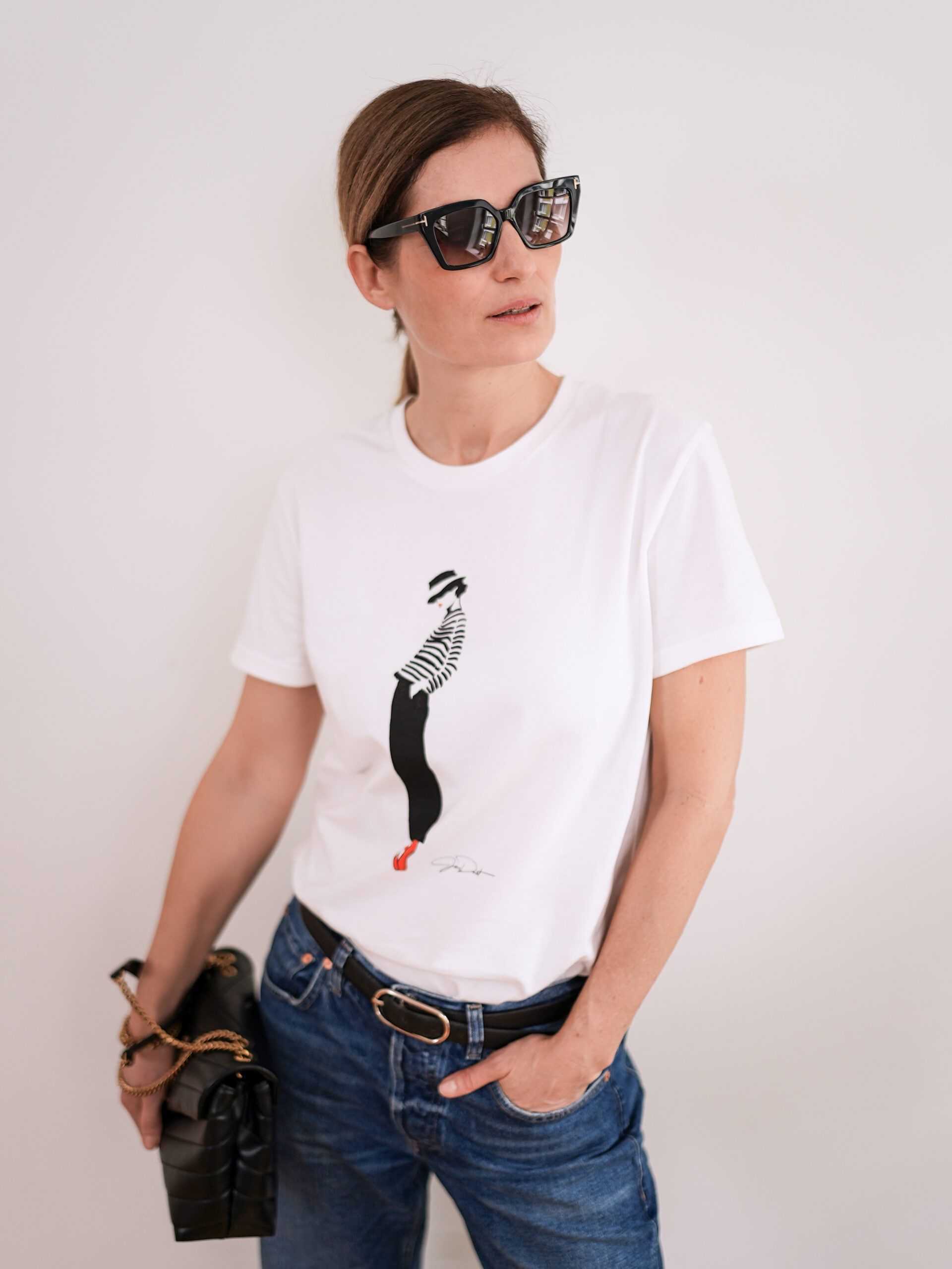 T-Shirt COCO BALLERINA bringt Kunst und Mode in ein klares, modernes Statement. Das Motiv der Künstlerin Jessica Durrant zeigt eine stilvolle, französisch inspirierte Silhouette, die Ruhe und Ausdruckskraft kombiniert. Das Ballerina T-Shirt passt zu schlichten Outfits und setzt zugleich einen markanten Akzent. Der weiche Baumwollstoff sorgt für ein angenehmes Gefühl im Alltag.